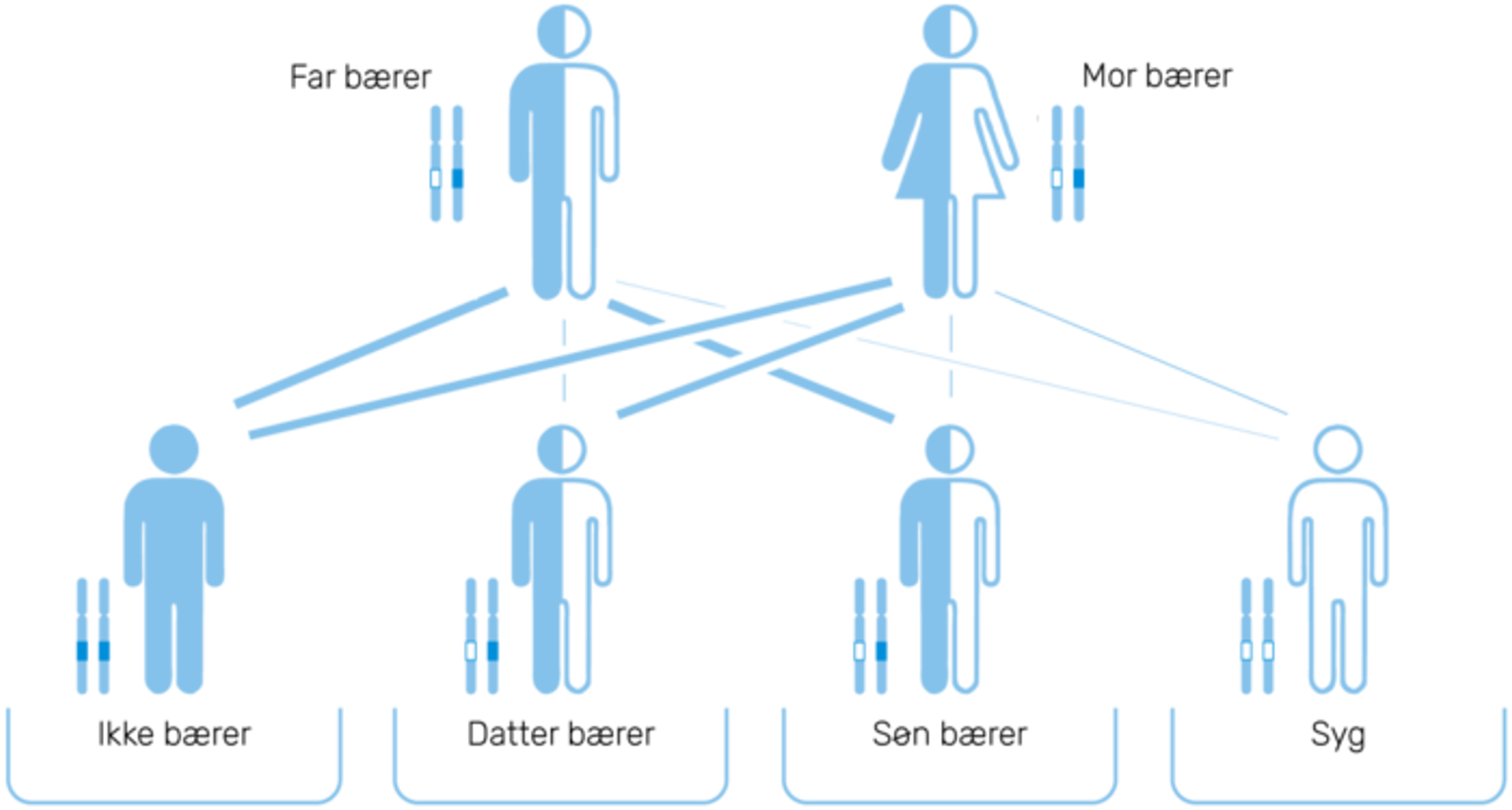 Sum tað sæst á myndini, so eru sannlíkindini hjá einum pari, har bæði foreldrini eru berarar, at 1/4 (25%) av børnunum verða ”ikki berarar”; 2/4 (50%) verða berarar; og 1/4 (25%) verða dupult berarar og altso sjúk.