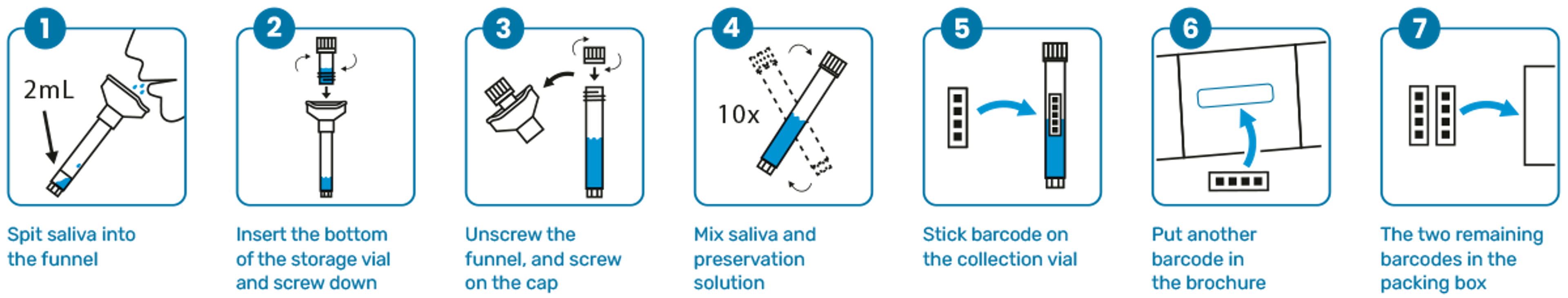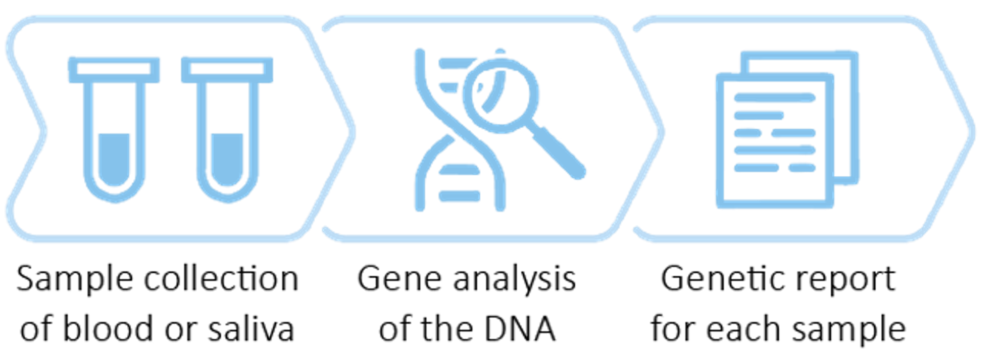 To do the test, a sample of saliva or blood is necessary. To collect the saliva sample, we will send a sample collection kit with instructions for collecting the sample, and shipping instructions for sending the sample to Amplexa Genetics.